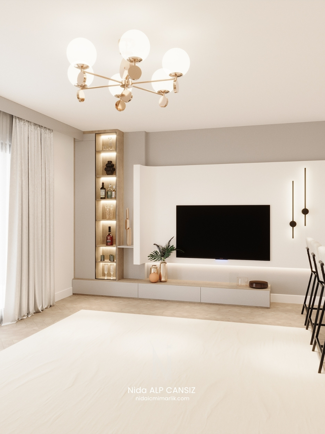 Bodrum’da deniz manzarasına sahip bir daire için hazırladığımız bu konut iç mimari tasarım projesi, manzaranın ve doğal ışığın iç mekânla daha güçlü bir ilişki kurmasını hedefleyen bir yaklaşımla ele alındı. Tasarım sürecinde önceliğimiz, mekânın ferahlığını koruyan, sakin ve zamansız bir yaşam alanı oluşturmaktı.
