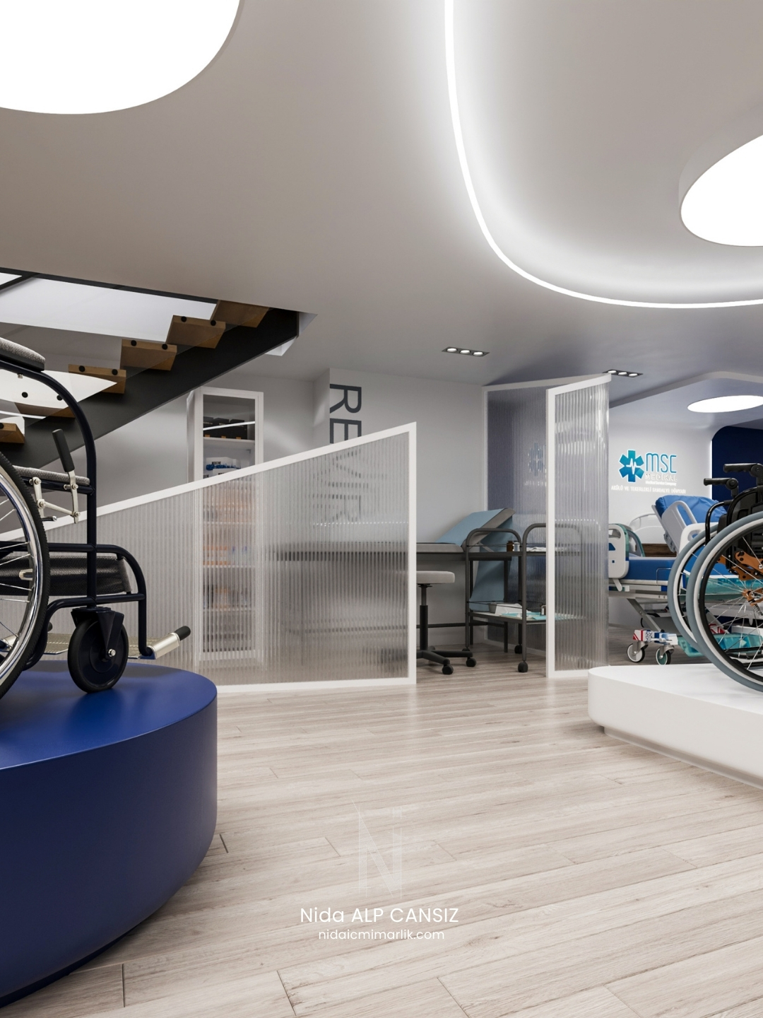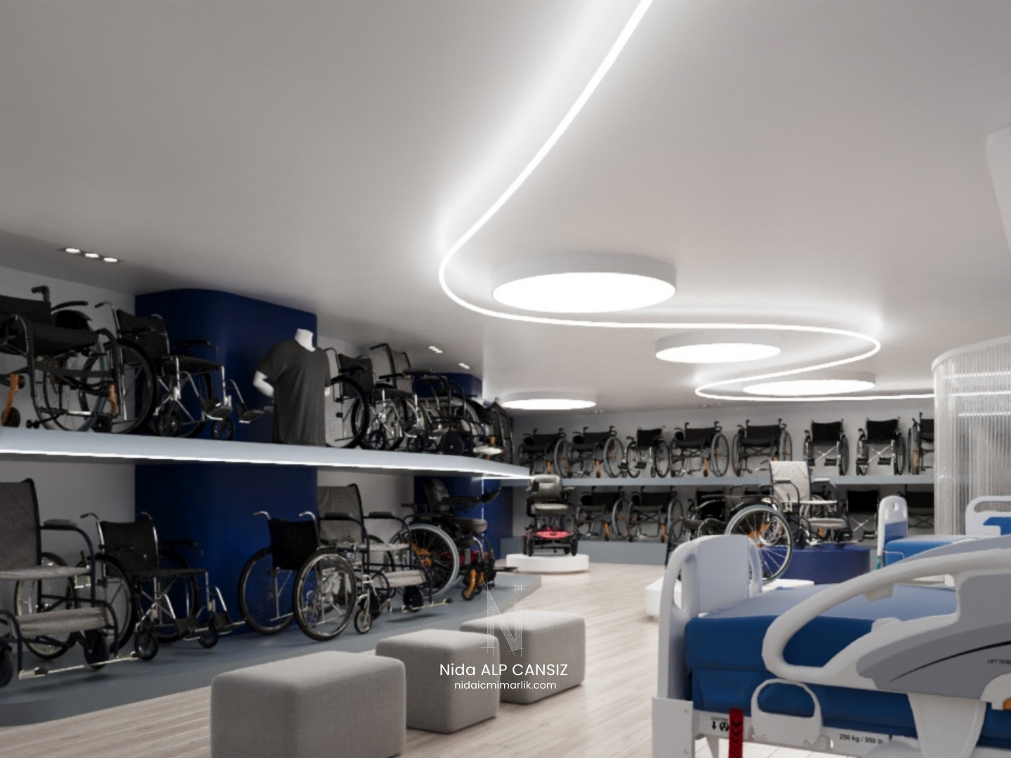 Tasarım sürecinde ürün çeşitliliği, dolaşım alanları ve kullanım senaryoları detaylı şekilde analiz edildi. Tekerlekli sandalye, medikal yatak ve teknik ekipman gibi büyük hacimli ürünler için hem sergileme hem de hareket alanı sağlayan çözümler geliştirildi. Açık ve okunabilir yerleşim planı sayesinde ziyaretçilerin mağaza içinde yön bulması kolaylaştırıldı.