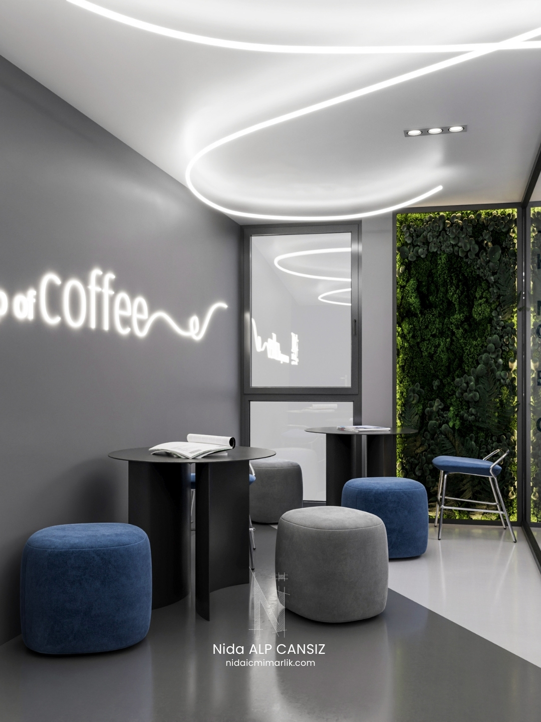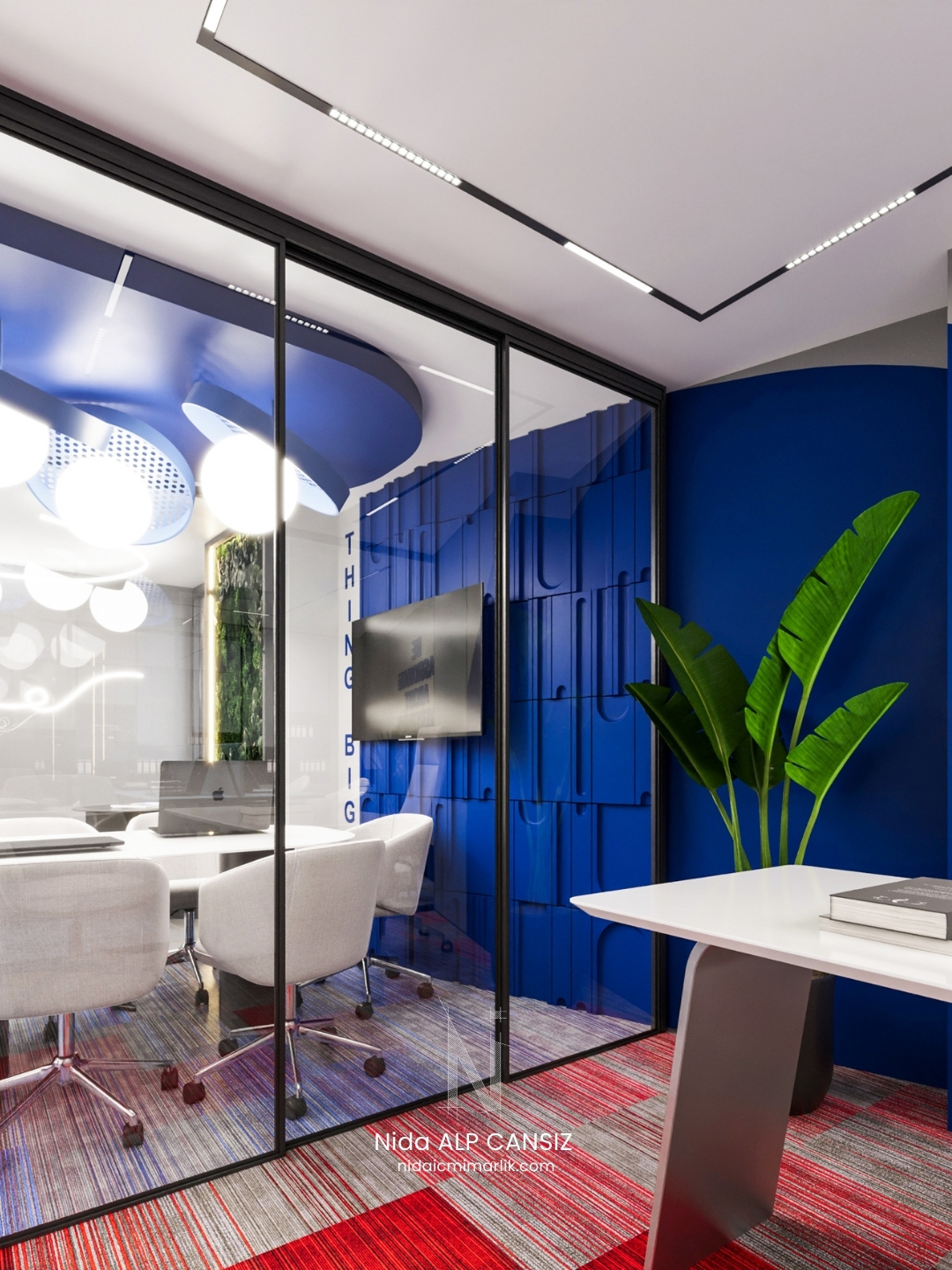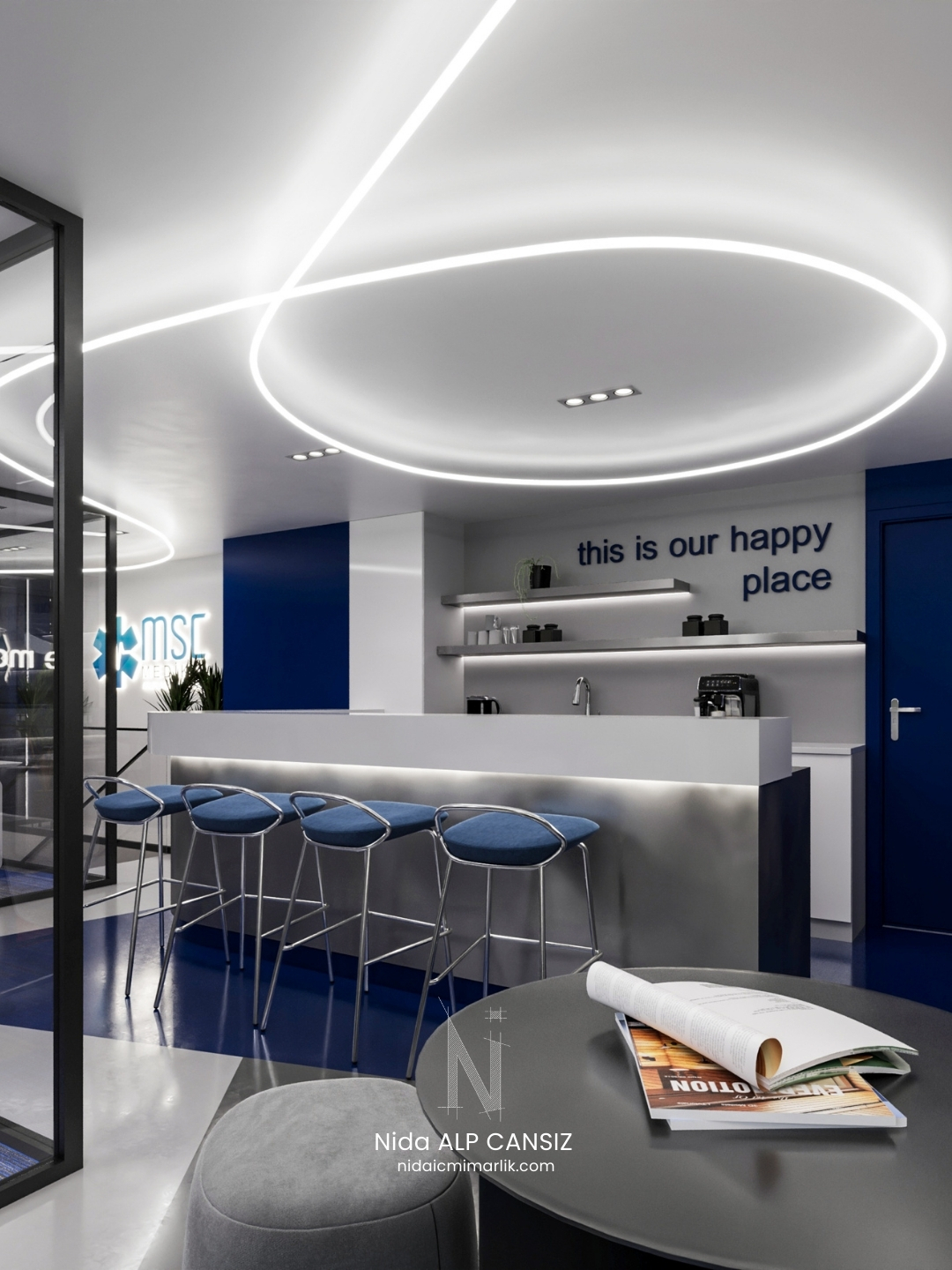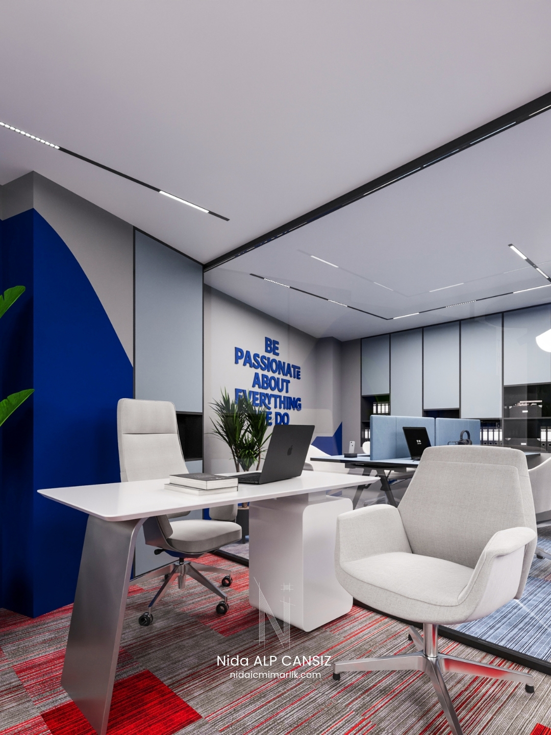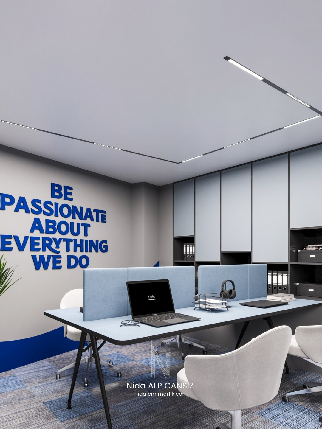Ofis ve toplantı alanlarında ise daha sakin ve odaklanmayı destekleyen bir tasarım dili benimsendi. Çalışma alanları, gün ışığı ve yapay aydınlatma dengesi gözetilerek planlandı. Bu sayede hem çalışan konforu hem de verimli bir çalışma ortamı hedeflendi.
